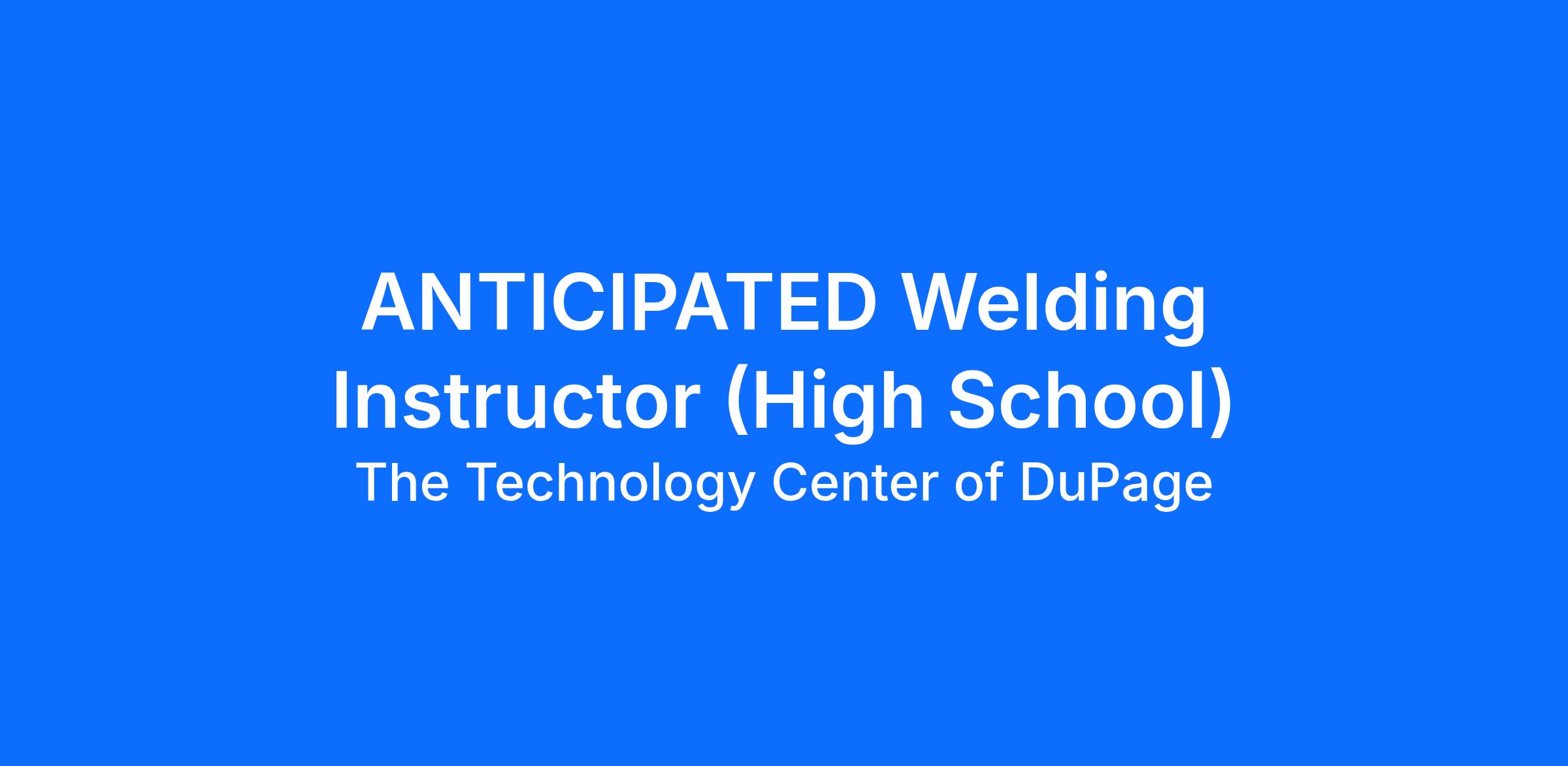-Must meet all qualifications for the appropriate license though the Illinois State Board of Education. Valid Professional Educator License that is current and registered in DuPage County with endorsement in Welding Technology (Candidates with valid ISBE teaching licenses must also have at least two years of directly related work experience).