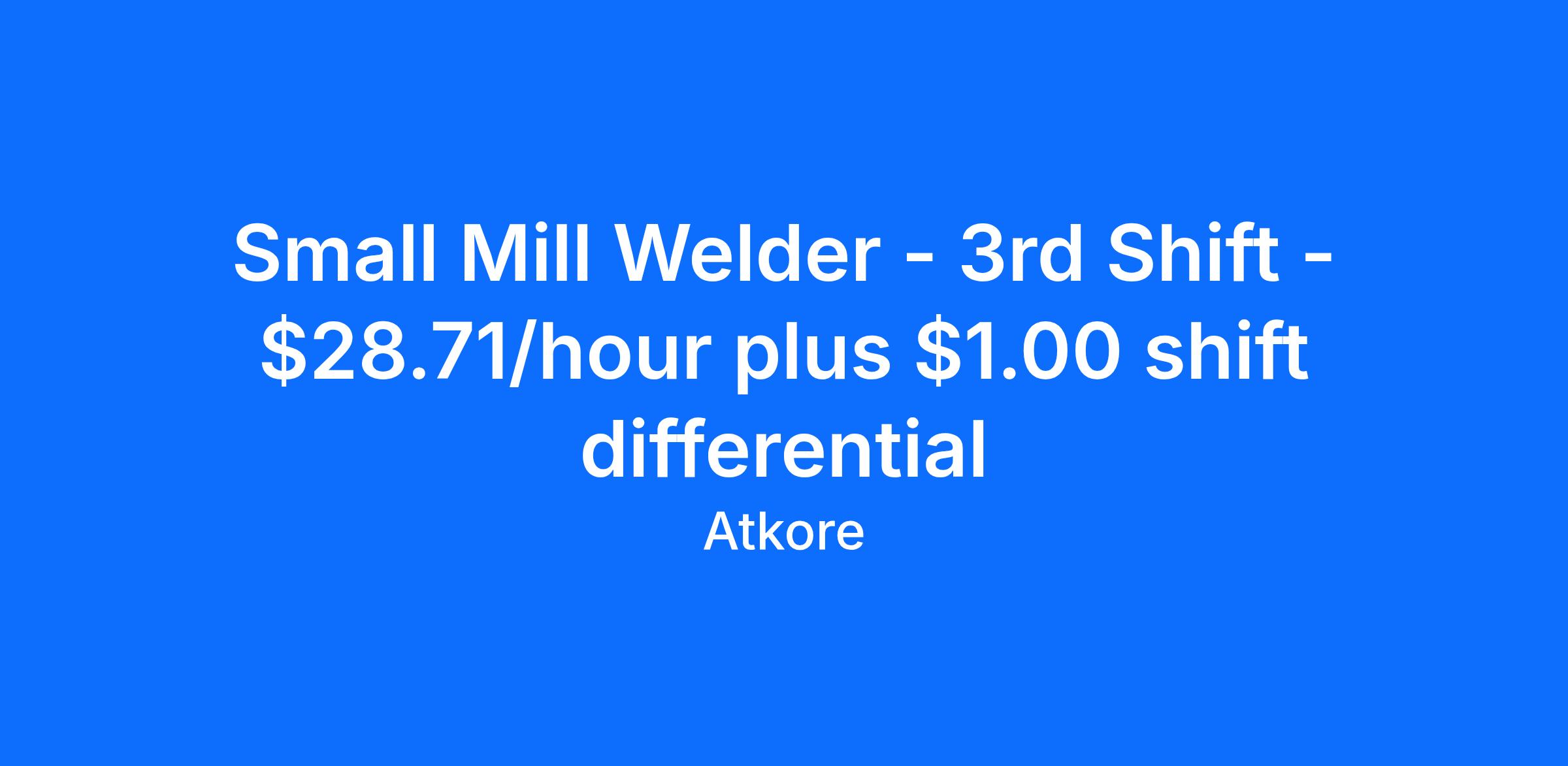 Small Mill Welder - 3rd Shift - $28.71/hour plus $1.00/hour shift differential