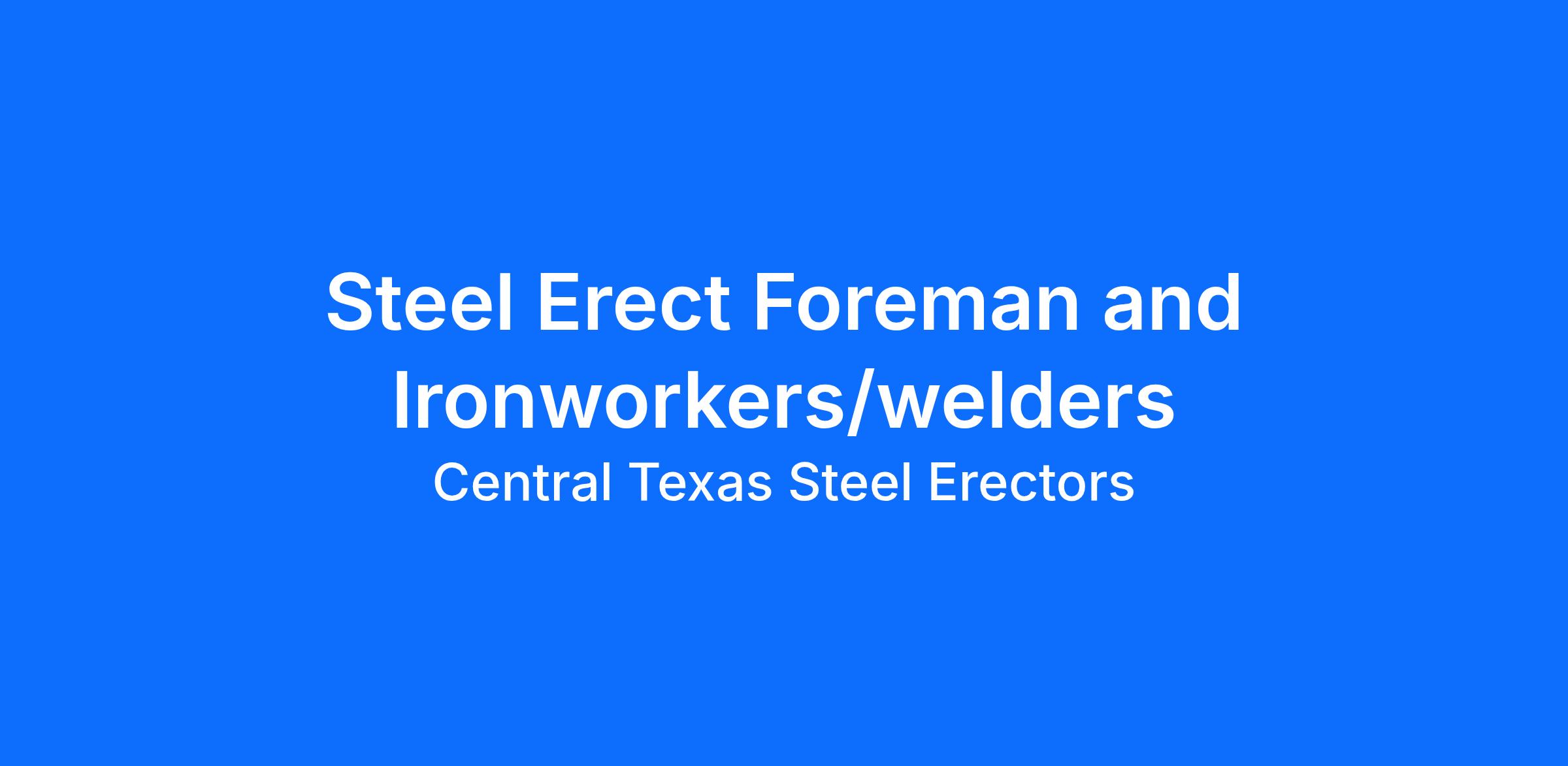 Join Central Texas Steel Erectors as a Steel Erect Foreman and Ironworker/Welder in Portland, TX! This exciting opportunity allows you to lead a dedicated team in the construction of high-quality steel structures while ensuring safety and efficiency on the job site.