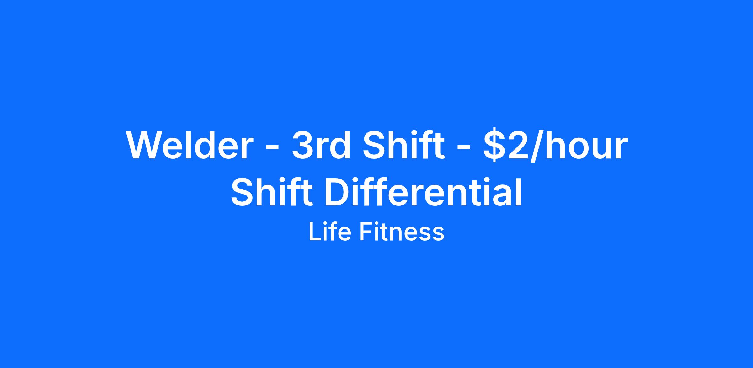 This position is eligible for a $1.00 per hour shift differential for hours worked on 3rd shift, in addition to the base hourly wage.Life Fitness / Hammer Strength offers a comprehensive package of benefits for full-time team members, including, but not limited to: a 401(k) savings plan with 4% employer match; medical, dental and vision insurance, parental, medical and military leaves of absence, paid time off including paid holidays, company paid short-term disability and optional long-term disability, health savings account, health care and dependent care reimbursement accounts, employee and dependent life insurance and supplemental life and AD&D insurance; identity protection, legal services, adoption assistance, tuition assistance, commuter benefits, employee discounts, and an employee assistance program that includes free counseling sessions. Eligibility for benefits is governed by the applicable plan documents and policies.